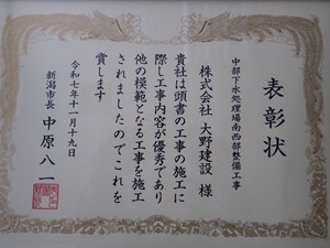 令和元年10月31日、令和元年度新潟市優良工事表彰を受賞しました。